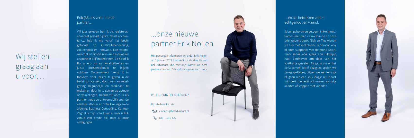 Met trots informeren wij u dat Erik Noijen op 1 januari 2022 toetreedt tot de directie van Bol Adviseurs, die met zijn komst uit acht partners bestaat.
